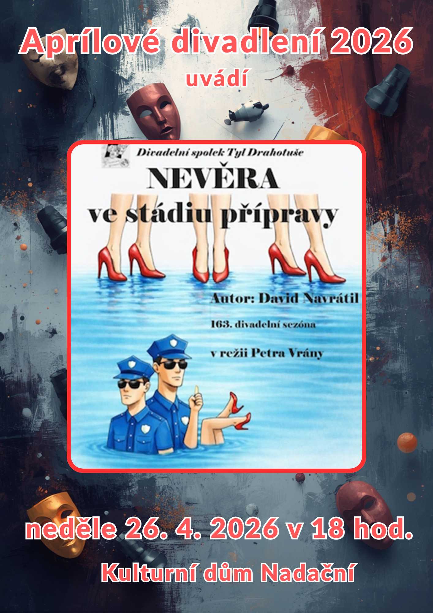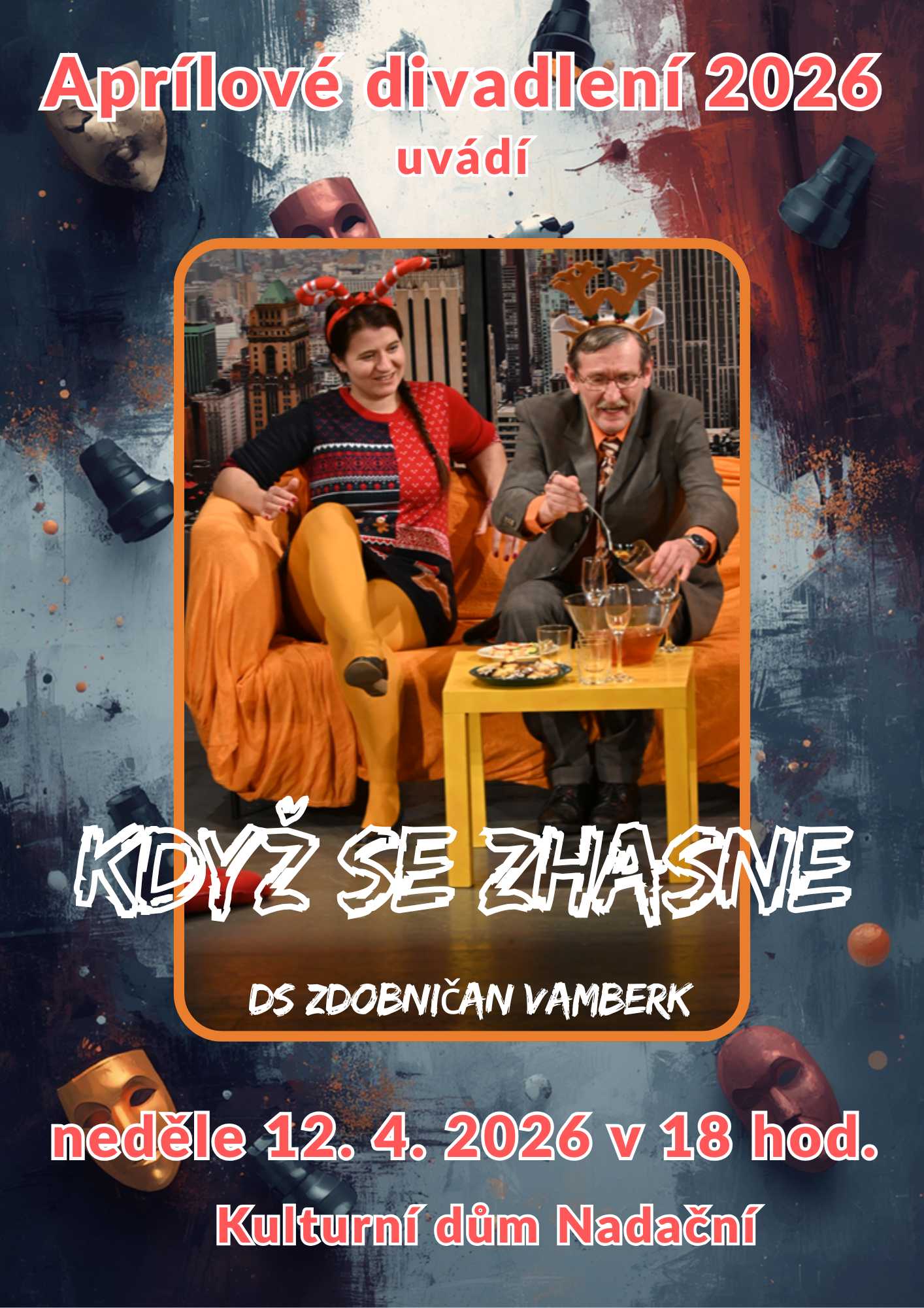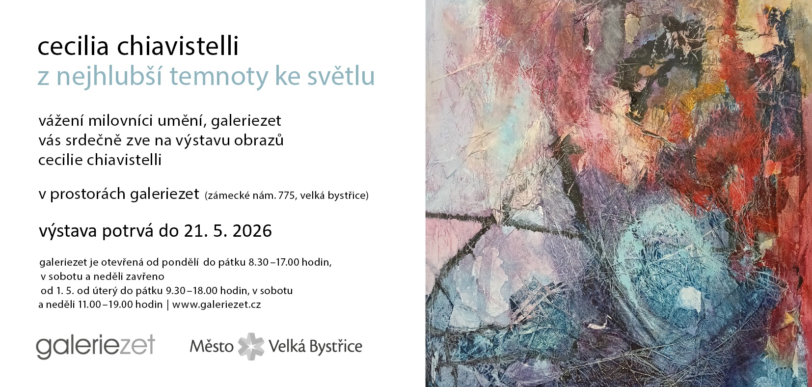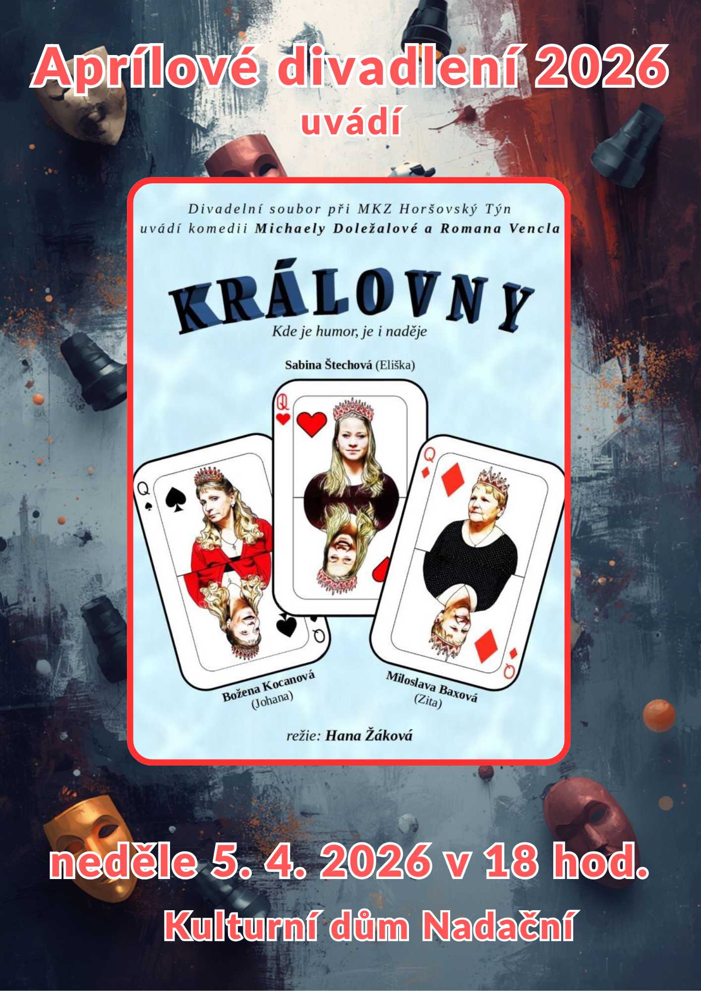 Velká Bystřice- Přehled akcí Typ: DOCX dokument, Velikost: 40.14 kBVelikonoční jarmark Typ: JPG obrázek, Velikost: 102.15 kBvýstava Typ: JPG obrázek, Velikost: 496.6 kBBílý kámen 2026 Typ: JPG obrázek, Velikost: 415.64 kBKrálovny Typ: JPG obrázek, Velikost: 254.41 kBKdyž se zhasne Typ: JPG obrázek, Velikost: 274.62 kBRomeo, Julie a tma Typ: JPG obrázek, Velikost: 279.1 kBTři na lavičce Typ: JPG obrázek, Velikost: 278.66 kBNevěra ve stádiu přípravy Typ: JPG obrázek, Velikost: 239.51 kBV měsíci dubnu 2026 se ve Velké Bystřici koná řada zajímavých akcí pro všechny věkové kategorie. Od výstavy obrazů Cecilie Chiavistelli v galerii Zet, která potrvá do 21. května, po tradiční Velikonoční jarmark a pletení tatarů, které se uskuteční 1. dubna v Zámecké mateřské škole. V KD Nadační se budou konat divadelní představení, včetně Aprílového divadlení s různými inscenacemi. Na konci měsíce se můžete těšit na čištění řeky Bystřice a jarní SWAP. Vstupenky na některé akce je možné zakoupit v Kulturním a informačním centru Velká Bystřice.