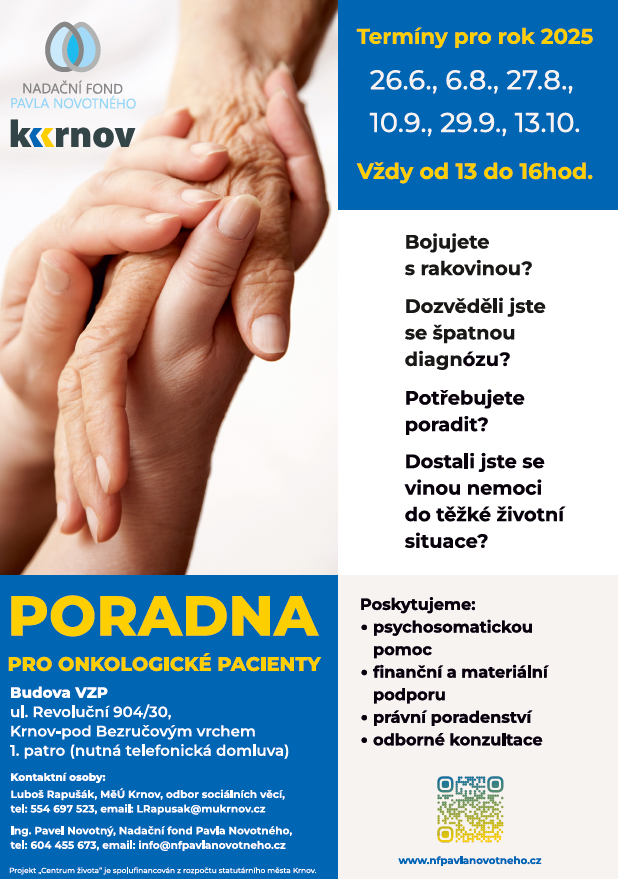 Leták Typ: PNG obrázek, Velikost: 387.34 kBFoto 1 Typ: JPG obrázek, Velikost: 4.38 MBPacienti onkologické ambulance v Krnově mají nyní možnost vyzkoušet novinku v podobě bezplatných chladicích čepic Ice Cap, které pomáhají snížit riziko vypadávání vlasů při chemoterapii. Tato čepice udržuje chlad díky gelové vložce a může být vyměněna za čerstvě namraženou kdykoliv během terapie. Projekt vznikl na základě iniciativy onkologické pacientky a ve spolupráci s Nadačním fondem Pavla Novotného, přičemž osm těchto čepic už čeká v mrazáku na pacienty.