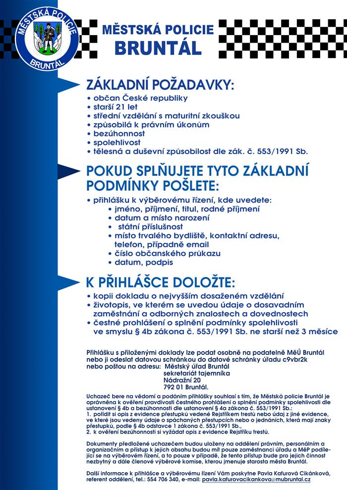 Nábor nových strážníků bruntál Typ: PDF dokument, Velikost: 92.11 kBZákladní požadavky Typ: PDF dokument, Velikost: 67.59 kBLetá Typ: JPG obrázek, Velikost: 113.88 kBleták 1 Typ: JPG obrázek, Velikost: 123.12 kBLeták 2 Typ: JPG obrázek, Velikost: 145.95 kBMěstská policie v Bruntále hledá nové strážníky. Nabízí stabilní zaměstnání s náborovým příspěvkem 100 000 Kč a průměrným hrubým příjmem 47 000 Kč. K tomu přidává půlroční a celoroční odměny a zaměstnanecké benefity v průměrné hodnotě 13 200 Kč ročně. Strážníci mají také nárok na 5 týdnů dovolené a 5 dní sick days. Příležitost získat zbrojní průkaz a pracovat s moderními technologiemi činí tuto pozici atraktivní. Pro více informací kontaktujte číslo 554 706 581.